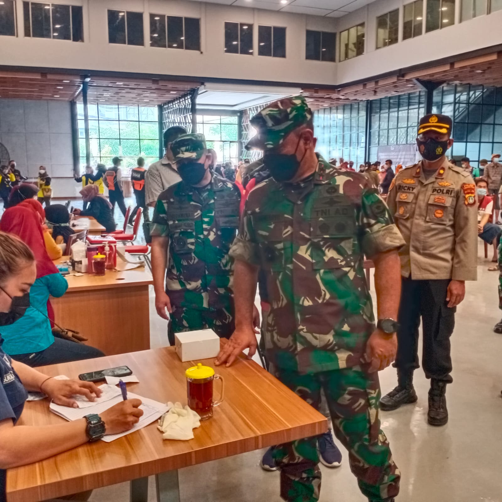 Dalam kegiatan peninjauan vaksinasi Pangdam Jaya didampingi Asintel Kasdam Jaya, Asops Kasdam Jaya, Aster Kasdam Jaya, Kakesdam Jaya, Kapendam Jaya dan Dandim 0506/JU. (Sumber Pendam Jaya)