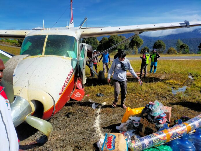 Global Cyber News.Com|Jayapura – Pesawat jenis SAS PK-FSW yang bermuatan sembako dan enam orang penumpang tergelincir di bandara Bilorai Sugapa Kabupaten Intan Jaya, pada Senin (28/2).