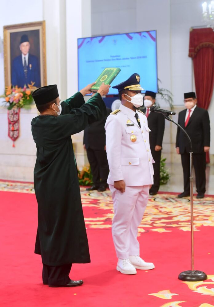 “Saya bersumpah akan memenuhi kewajiban saya sebagai gubernur dengan sebaik-baiknya dan seadil-adilnya, memegang teguh Undang-Undang Dasar Negara Republik Indonesia tahun 1945 dan menjalankan segala undang-undang, dan peraturannya dengan selurus-lurusnya serta berbakti kepada masyarakat, nusa, dan bangsa,” ucap Presiden mendiktekan penggalan sumpah jabatan.