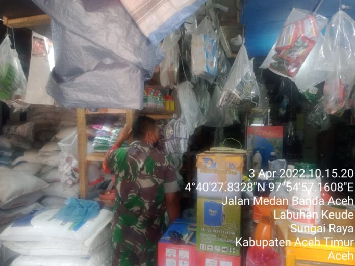 Global Cyber News.Com|Aceh Timur – Sertu Untung W. Babinsa Koramil 12/Sry Kodim 0104/Atim berkunjung ke U.D (Unit Dagang) Tani Jaya milik Hasballah (54) di Desa Labuhan Keude Kec. Sungai Raya Kab. Aceh Timur, Minggu (03/04/2022).
