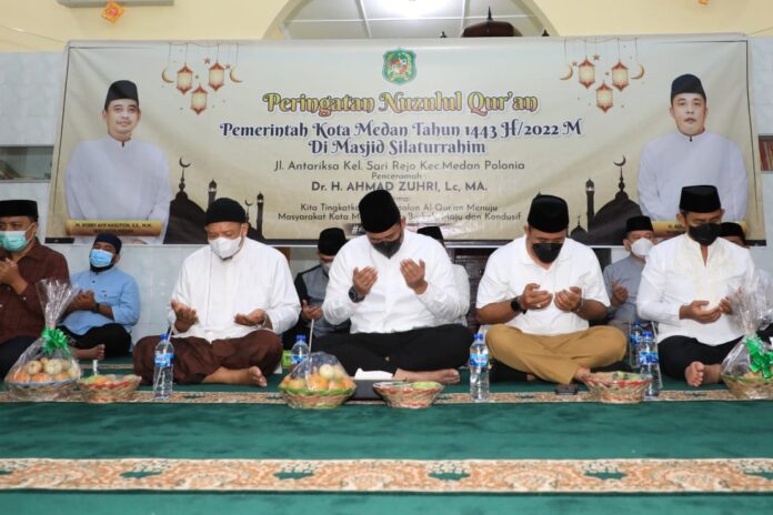 Global Cyber News.Com|Suasana khidmat dan hangat begitu terasa dalam peringatan Nuzulul Qur’an yang digelar Pemko Medan di Masjid Silaturahim, Jalan Antariksa, Kelurahan Sari Rejo, Kecamatan Medan Polonia, Senin (18/4). Kegiatan peringatan Nuzulul Qur’an atau malam ke -17 Ramadhan 1443 H ini bertemakan melalui peringatan Nuzulul Qur’an kita tingkatkan Pengamalan Al Qur’an menuju masyarakat kota Medan yang berkah, maju dan kondusif.