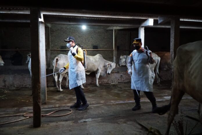 Global Cyber News.Com|Bupati Kendal Dico M Ganinduto bersama Kaporles Kendal AKBP Yuniar Ariefianto menyemprotkan cairan disinfektan ke kandang sapi di Desa Lanji antisipasi penyebaran PMK.