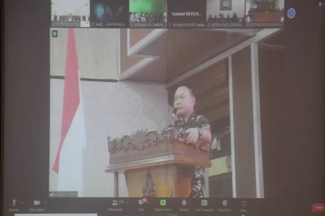 Global Cyber News.Com|Madiun, – Ratusan prajurit dan PNS Korem 081/DSJ menerima arahan dari Kepala Staf Angkatan Darat (Kasad), Jenderal TNI Dudung Abdurachman melalui Vicon, bertempat di Aula Jenderal Sudirman Makorem, Jl. Pahlawan No. 50 Kota Madiun.