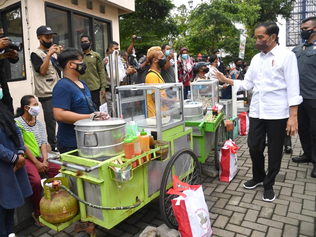 Setelah berkeliling pasar dan juga menyapa para penjual dan pembeli, Presiden dan Ibu Iriana membagikan bantuan langsung kepada para penerima manfaat.