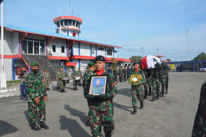 Global Cyber News.Com|Sentani – Kepala Staf Korem (Kasrem) 172/PWY Kolonel Inf Bayu Sudarmanto selaku Wadankolakops bertindak sebagai Inspektur Upacara pada upacara pengantaran jenazah personel Satgas Pamtas RI-PNG Yonif 126/Kala Cakti Almarhum Pratu Murry Aldino, bertempat di Lapangan Air Nav Bandara Sentani, Distrik Sentani, Kab. Jayapura, Jumat (24/6).