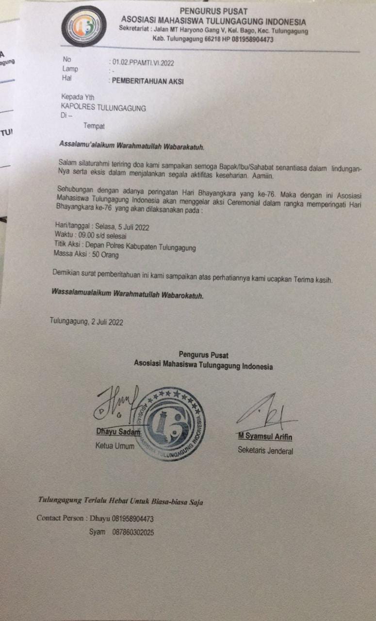 Beredar surat pemberitahuan Asosiasi Mahasiswa Tulungagung Indonesia (AMTI) yang berencana melaksanakan aksi di depan Mapolres Tulungagung pada Selasa Pagi 05/07/2022 besok.