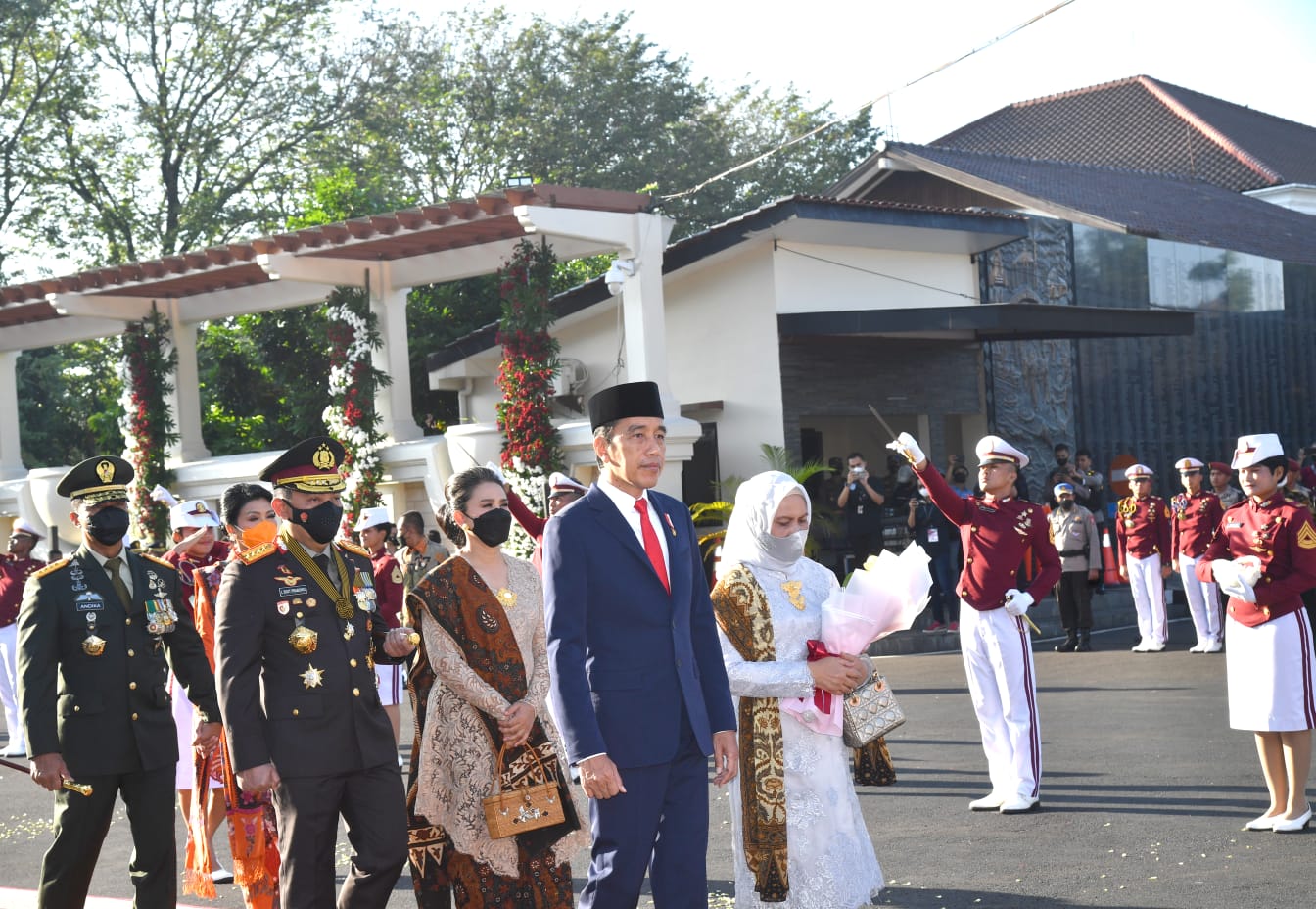 Setibanya di lokasi, Presiden yang mengenakan setelan jas berwarna biru dan Ibu Iriana yang mengenakan kebaya berwarna putih, terlebih dahulu menerima laporan Komandan Detasemen Korps Taruna Irfan Urane Azis dan dilanjutkan dengan penyerahan bunga tangan dari taruni kepada Ibu Iriana.