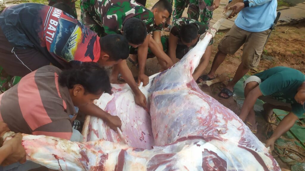 Selanjutnya Ia mengatakan, setelah pelaksanaan sholat Idul Adha, dilanjutkan pemotongan hewan kurban yang dilakukan oleh anggota Satgas secara bergotong royong bersama warga karena masyarakat juga ada yang melaksanakan Qurban . Daging yang sudah ada akan dimasukkan kedalam wadah plastik untuk didistribusikan langsung kepada warga.