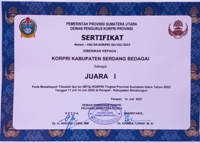 Kafilah MTQ Korpri Serdang Bedagai sabet 9 Juara yang menjadikan Sergai Juara Umum MTQ Korpri Tingkat Provinsi Sumatera Utara yang digelar di Parapat Kecamatan Girsang Sipangan Bolon Kabupaten Simalungun 11-14 Juli 2022.