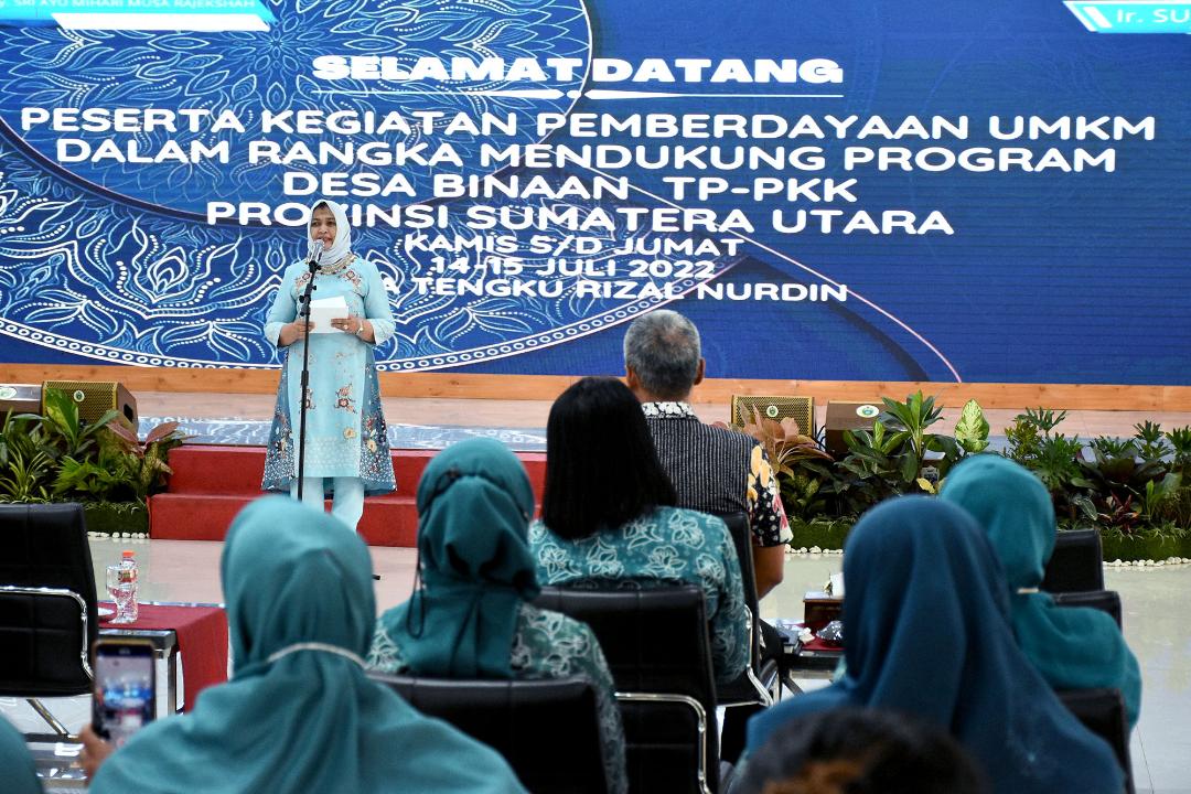 Hal ini disampaikan Nawal Lubis saat membuka kegiatan Pemberdayaan UMKM dalam rangka mendukung Program Desa Binaan TP PKK Sumut di Aula Tengku Rizal Nurdin, Rumah Dinas Gubernur Sumut, Jalan Jenderal Sudirman Nomor 41 Medan, Kamis (14/7). Hadir di antaranya Kepala Dinas Koperasi dan UKM Sumut Suherman, Pokja TP PKK Sumut, narasumber serta peserta yang terdiri dari kabupeten/kota di antara Binjai, Deliserdang dan Tebingtinggi.