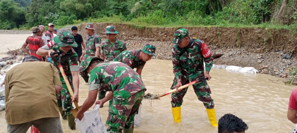 Global Cyber News.Com|[Maluku Tengah] – Anggota Satgas Kodim Maluku Yonarhanud 11/WBY Pos Ramil Wakal bersama warga bergotong royong membuat tanggul darurat dengan karung yang berisikan tanah dan batu dalam rangka mengantisipasi adanya gelombang tinggi dan banjir susulan di Negeri Kaitetu, Kecamatan Leihitu, Kabupaten Maluku Tengah, Minggu (17/7/2022).