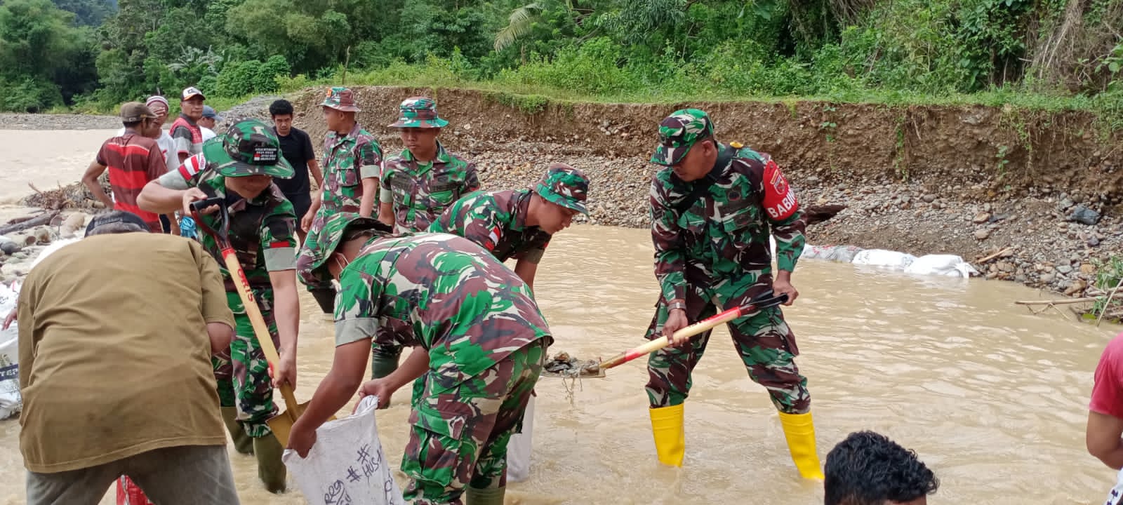 Terlihat anggota Pos Ramil Wakal bersama warga dengan gigih dan semangat mengemas tanah ke dalam karung-karung serta membawa karung tersebut ke tempat pembuatan tanggul.