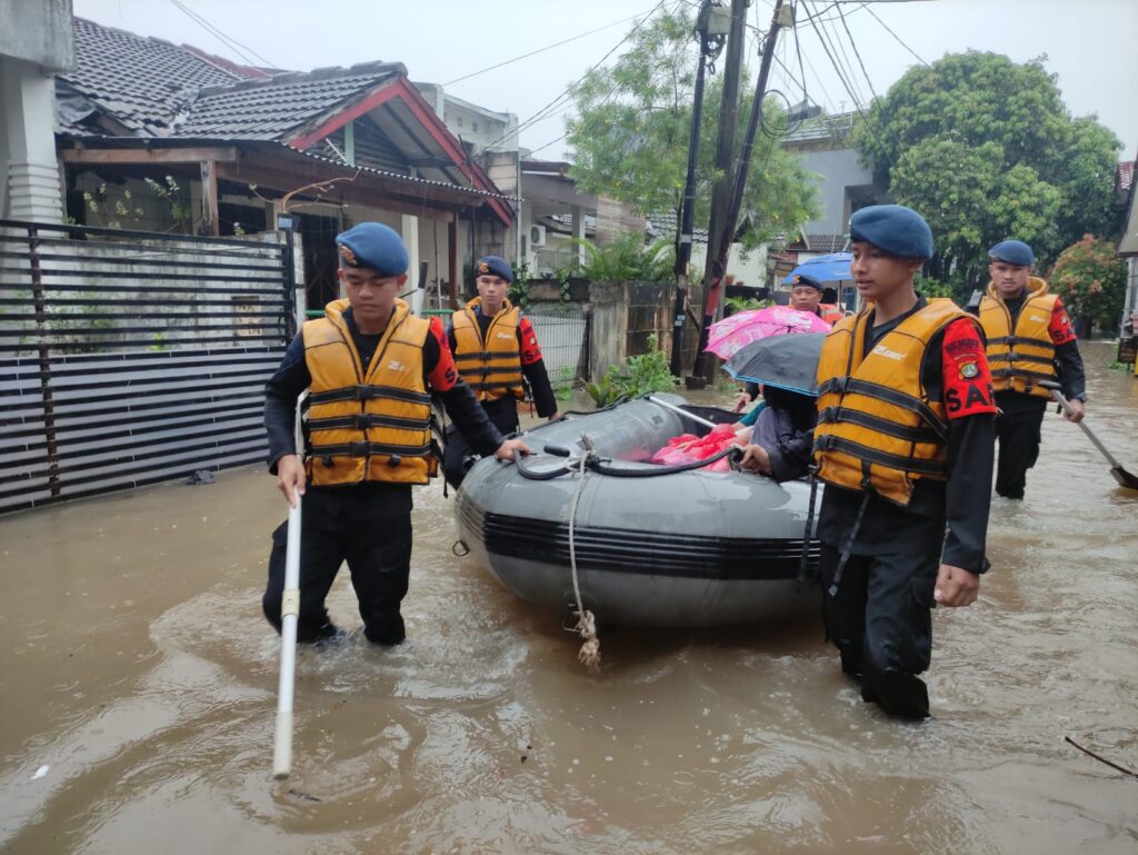 Global Cyber News.Com|TANGERANG – Tim SAR Batalyon C Pelopor Satbrimob Polda Metro Jaya berhasil melakukan evakuasi terhadap penderita Kemoterapi Kanker dan ibu hamil di tengah banjir yang menerjang Komplek Perumahan Duren Villa, Karang Tengah, Kota Tangerang, Sabtu, 16 Juli 2022 pagi hingga siang hari ini akibat hujan deras yg mengguyur jakarta dari semalam sampai siang hari ini