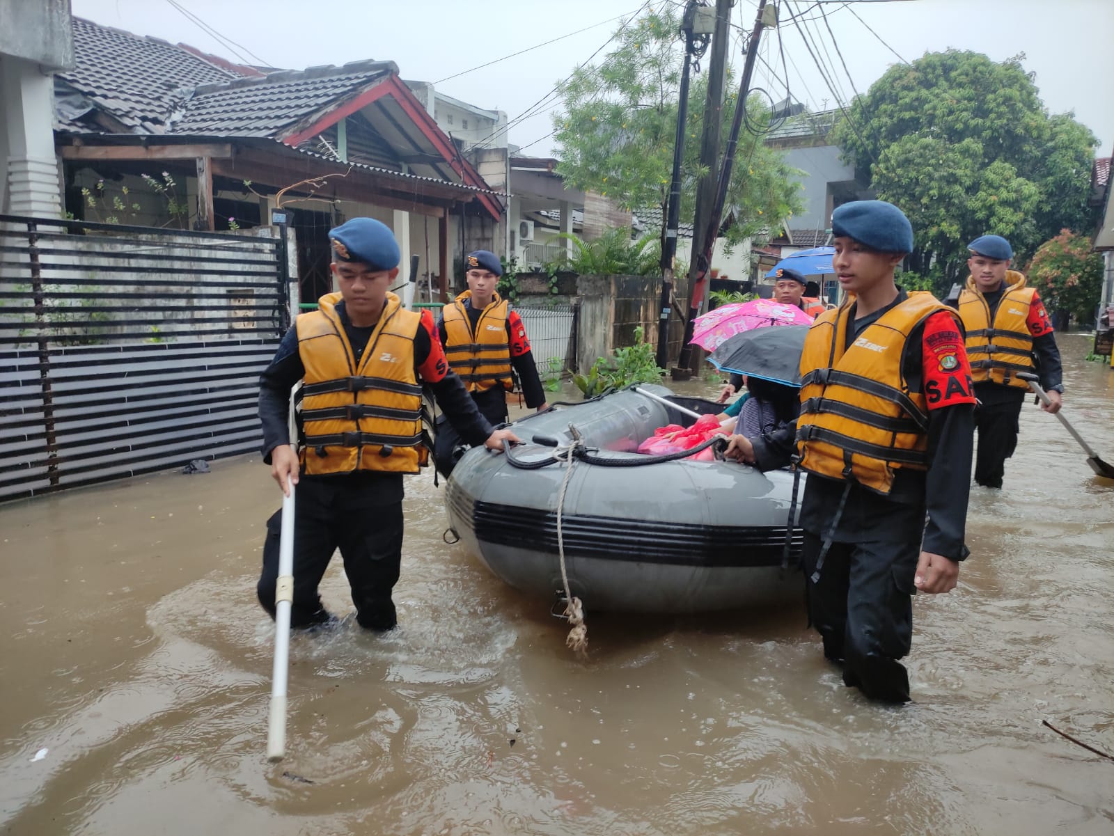 “Ya, kita mengerahkan personil Tim SAR sebanyak 1 ssr dipimpin Dpp Pasiops Batalyon C Pelopor Satbrimob Polda Metro Jaya AKP A. Yusuf,” terang AKP Anton. Dengan menggunakan perahu karet, Tim SAR menyusuri komplek pemukiman, melakukan pencarian dan penyelamatan terhadap warga yang terjebak banjir.