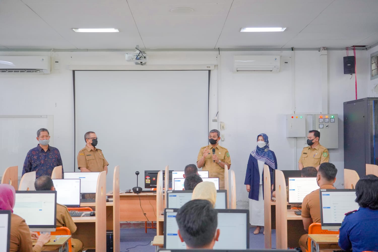 Ada dua ruangan yang ditinjau Wiriya dan di kedua ruangan tersebut, ia menekankan agar peserta tidak stres. “Kerjakan dengan tenang. Karena ini menggunakan komputer, maka hasilnya akan langsung kita ketahui. Usai ini, bapak ibu kembali ke tempat kerja masing-masing dan bekerjalah dengan baik,” pesannya.