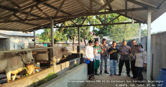 Global Cyber News.Com|Dalam rangka mendukung upaya pemerintah dalam percepatan vaksin PMK (Penyakit Mulut dan Kuku), Polsek Kertajati Polres Majalengka Polda Jabar melakukan pendampingan dan pengamanan proses vaksinasi terhadap hewan ternak dalam rangka Ops Aman Nusa II.