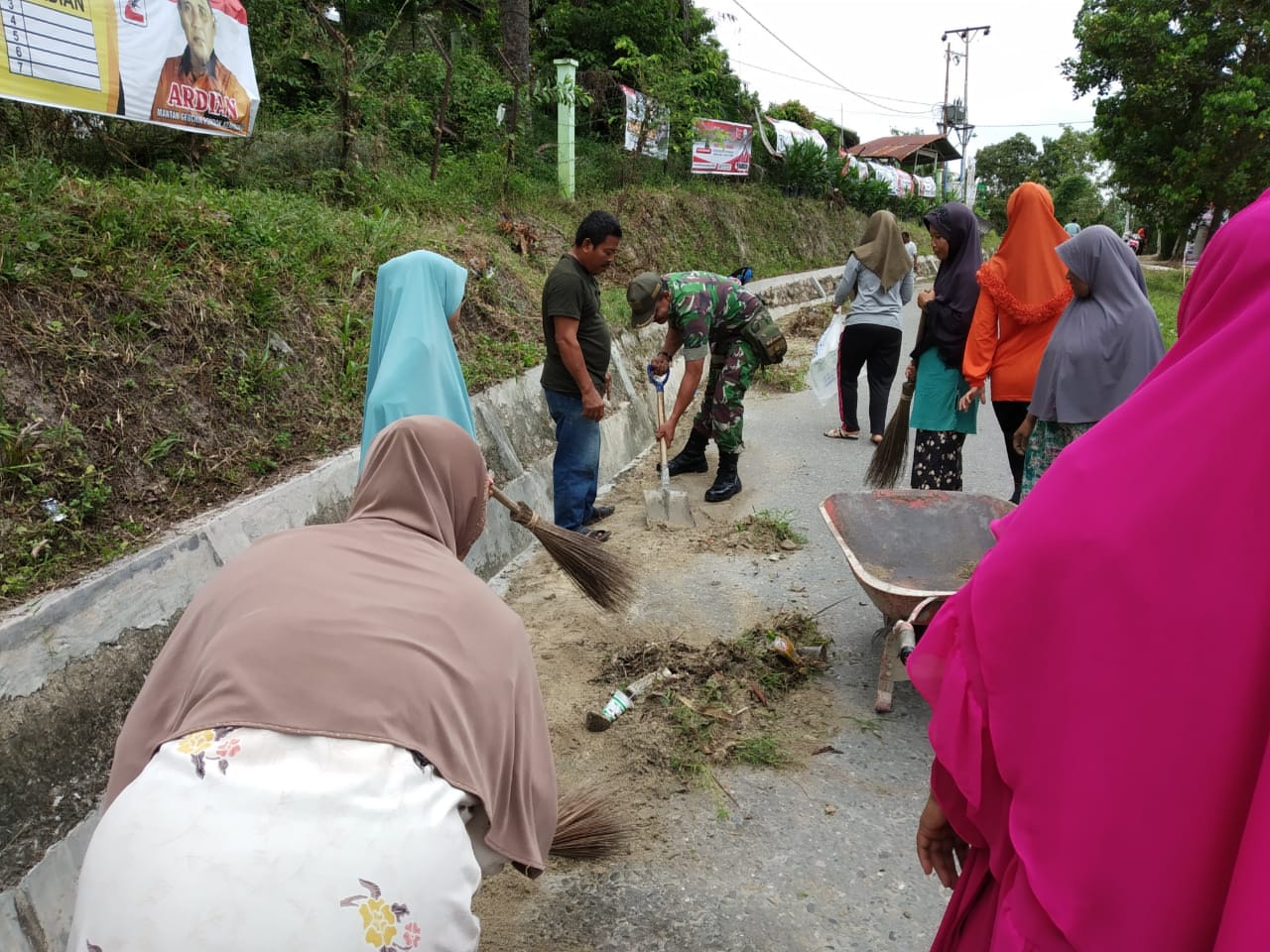 Kegiatan kerja bakti yang dilakukan bersifat gotong royong dengan dukungan Ibu PKK dan warga masyarakat setempat dengan sasaran pembersihan disekitar jln dan sekaligus tempat ibadah, dengan gotong-royong ini, TNI bersama masyarakat terus memegang teguh tradisi turun-temurun yang