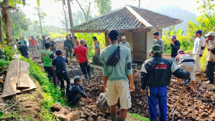 Satgas TNI Manunggal Membangun Desa (TMMD) ke-114 Kodim 0608/Cianjur melalui program peningkatan dan ketahanan pangan dengan membangun jalan di Desa Cibadak, Kecamatan cibeber, Kabupaten Cianjur masih dalam proses pengerjaan.