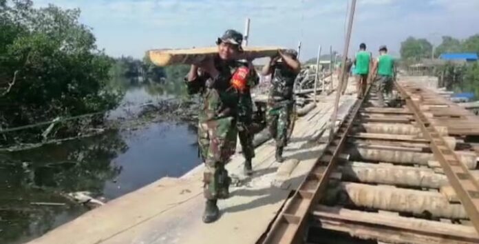 Global Cyber News.Com|Deli Serdang – Prajurit Kodam I/BB dari Satuan Yon Zipur I/DD bersama Prajurit Kodim 0201/Medan dan Pemerintah Desa beserta masyarakat melaksanakan Bakti Sosial berupa gotong royong untuk membangun jembatan darurat sementara sepanjang 25 Meter di Dusun l, Desa Tanjung Rejo, Kec. Percut Sei Tuan, Kab. Deli Serdang yang putus.