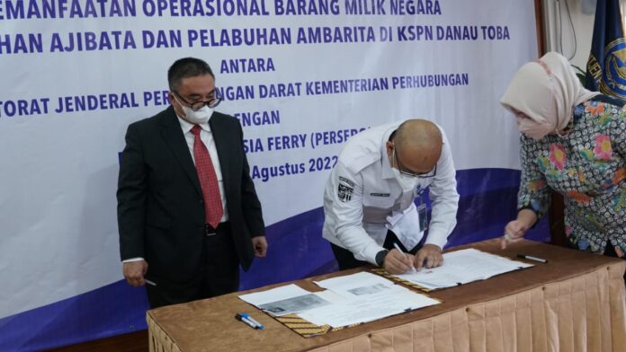 Global Cyber News.Com|JAKARTA (15/08) – Direktorat Jenderal Perhubungan Darat dan PT. ASDP Indonesia Ferry (Persero) menandatangani perjanjian Kerja Sama Pemanfaatan Operasional Barang Milik Negara (KSPO BMN) Pelabuhan Ajibata dan Pelabuhan Ambarita yang terletak di Kawasan Danau Toba pada Senin (15/08) di Kementerian Perhubungan, Jakarta.