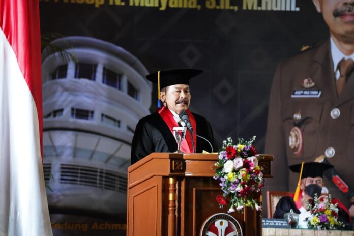 Global Cyber News.Com|Jaksa Agung ST Burhanuddin menyampaikan dalam kesempatan yang penuh suka cita ini, atas nama pribadi maupun pimpinan Kejaksaan Republik Indonesia mengucapkan selamat atas Pengukuhan Profesor Kehormatan Universitas Pendidikan Indonesia Bidang Ilmu Hukum, Prof. (H.C.) Dr. Asep N. Mulyana, S.H., M.Hum. dengan pidato ilmiah yang bertemakan“Rancang Bangun Model Integratif Penegakan Hukum Terhadap Kejahatan Korporasi Dan Bisnis”.Jaksa Agung mengatakan, tema yang diangkat tersebut menurut hemat kami sangat relevan dengan dinamika perkembangan hukum di Indonesia dewasa ini.