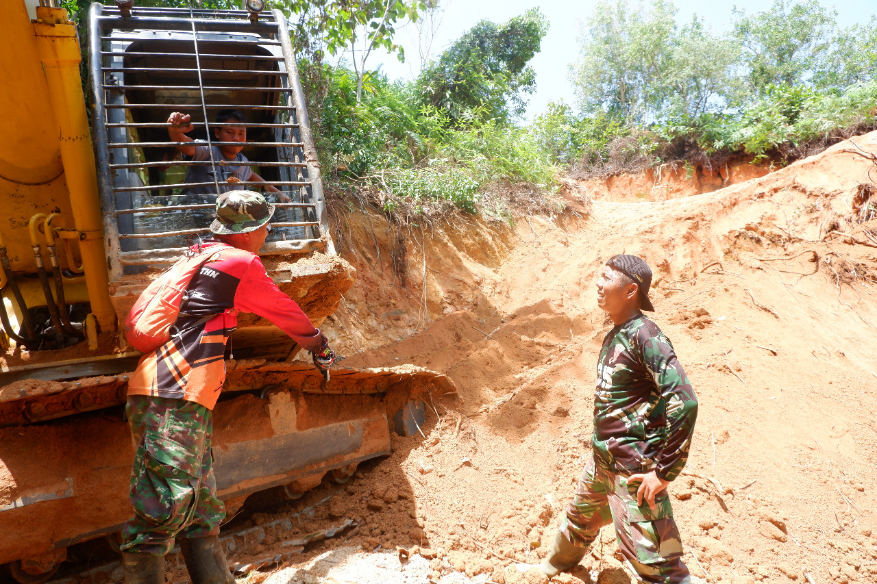 “Selain pembukaan jalan, kita juga mengerjakan dua buah jembatan sementara dengan ukuran 8 mtr x 4 mtr, dan ukuran 3 mtr x 4 mtr, untuk saat ini pengerjaan kedua jembatan itu sudah mencapai 99 %,” lanjut Dansatgas.