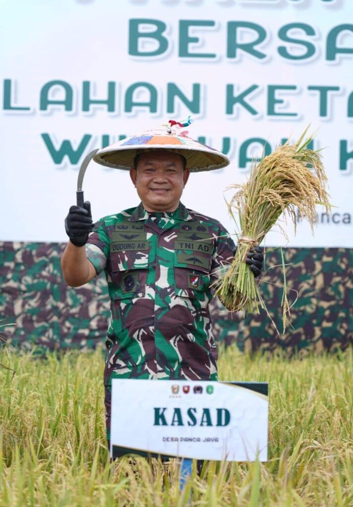 Global Cyber News.Com|JAKARTA,-Kepala Staf Angkatan Darat (Kasad) Jenderal TNI Dr. Dudung Abdurachman melaksanakan panen raya padi dalam rangka wujudkan Ketahanan Pangan Nasional sesuai instruksi Presiden RI Joko Widodo untuk mengoptimalkan lahan-lahan tidur untuk ditanami dengan berbagai tanaman pangan. Acara ini merupakan rangkaian kegiatan penutupan program TMMD ke-114 di wilayah Kodim 0906/Tgr Kabupaten Kutai Kartanegara, Kalimantan Timur, Rabu (24/8/2022).