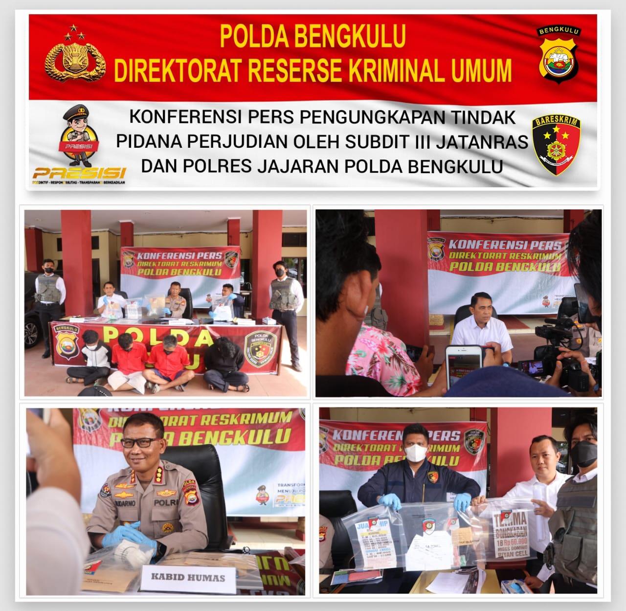 Menurut kabid humas polda bengkulu Kombes Pol Sudarno, S. Sos., M.H. didampingi Dir Reskrimum polda bengkulu Kombes Pol Teddy Suhendyawan Syarif S.I.K., M.Si dan Kasubdit 3 Jatanras Ditreskrimum Polda Bengkulu AKBP Lambe P Birana S.I.K., M.H. mengatakan, Penindakan kejahatan ini merupakan kegiatan rutin dilakukan Polda Bengkulu dan Polres jajaran Polda Bengkulu secara aktif melakukan penegakan hukum terhadap kejahatan yang meresakan masyarakat.