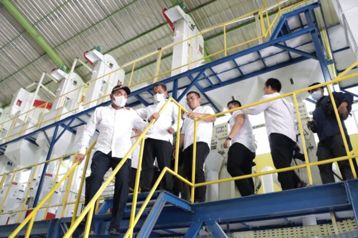 Bupati Serdang Bedagai (Sergai) H. Darma Wijaya dan Wakil Bupati H. Adlin Umar Yusri Tambunan, ST, MSP, menemani Gubernur Sumatera Utara (Gubsu) Edy Rahmayadi meninjau kilang padi Badan Usaha Milik Daerah (BUMD) PT. Dhirga Surya, di Jalan Gereja, Desa Kota Galuh, Kecamatan Perbaungan, Rabu (31/8/2022).