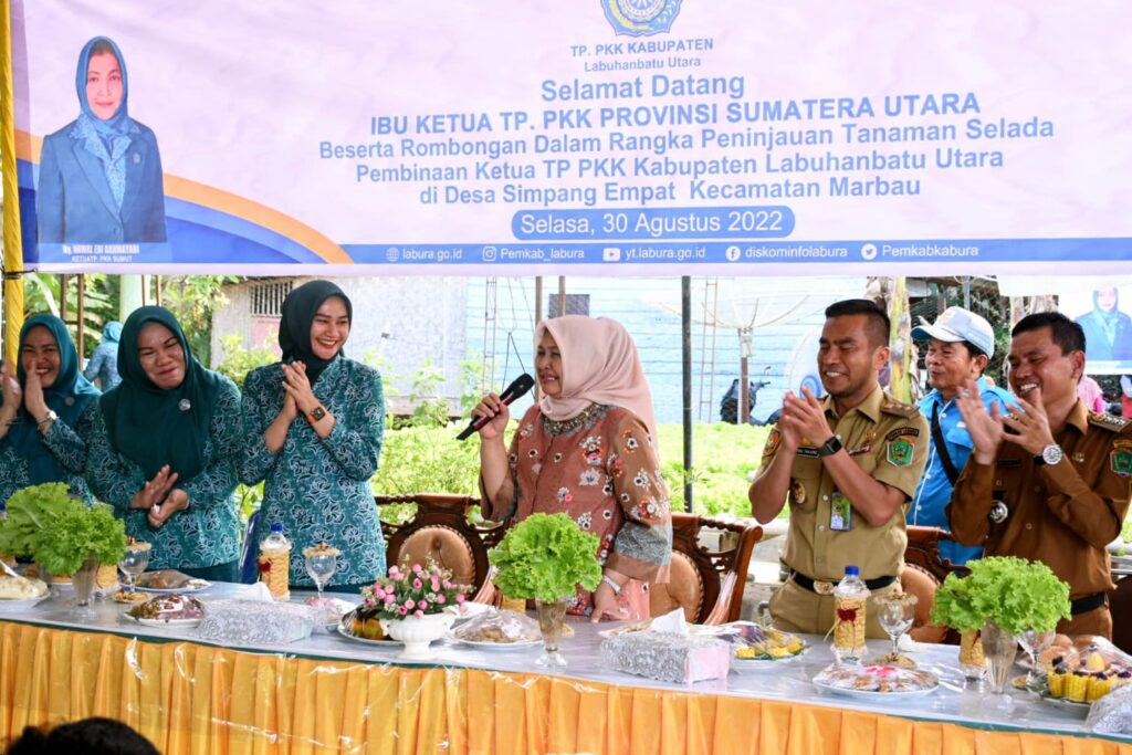 Global Cyber News.Com|-Labura I Ketua Tim Penggerak Pemberdayaan dan Kesejahteraan Keluarga (TP PKK) Sumatera Utara (Sumut) Nawal Lubis mendapat sambutan hangat dan meriah, saat berkunjung ke Desa Simpang Empat, Kecamatan Merbau, Kabupaten Labuhanbatu Utara (Labura).