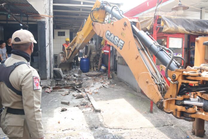 Global Cyber News.Com|Pemko Medan kembali melakukan pembongkaran bangunan yang berdiri diatas saluran drainase. Kali ini Tim pembongkaran yang terdiri dari Satpol PP Kota Medan, Dinas PU Kota Medan, Dishub kota Medan, Dinas Kominfo Kota Medan beserta jajaran dari Kecamatan Medan Area dan di bantu oleh personil Babinsa membongkar bangunan yang berada di jalan Asia Sp. Jalan Suasa, Rabu (31/8).