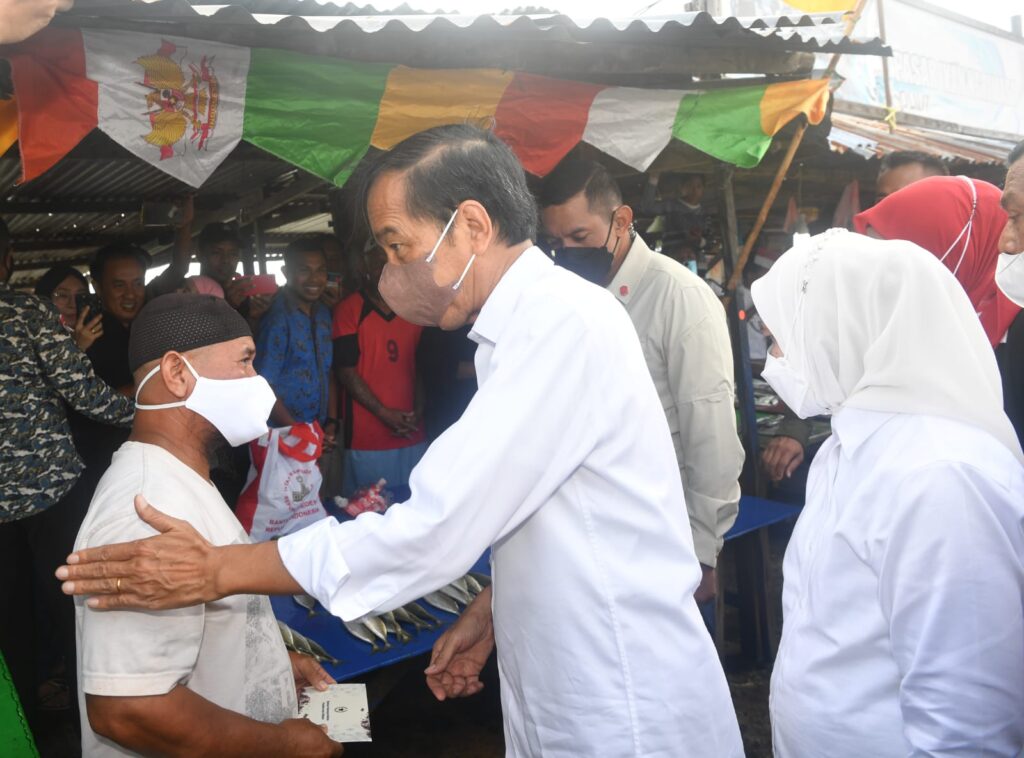 Menjelang tiba di pasar, ribuan warga menyambut kedatangan Presiden dan Ibu Iriana. Sebelum memasuki pasar, Presiden dan Ibu Iriana menyapa, berfoto, membagikan kaos, buku, dan masker kepada warga.