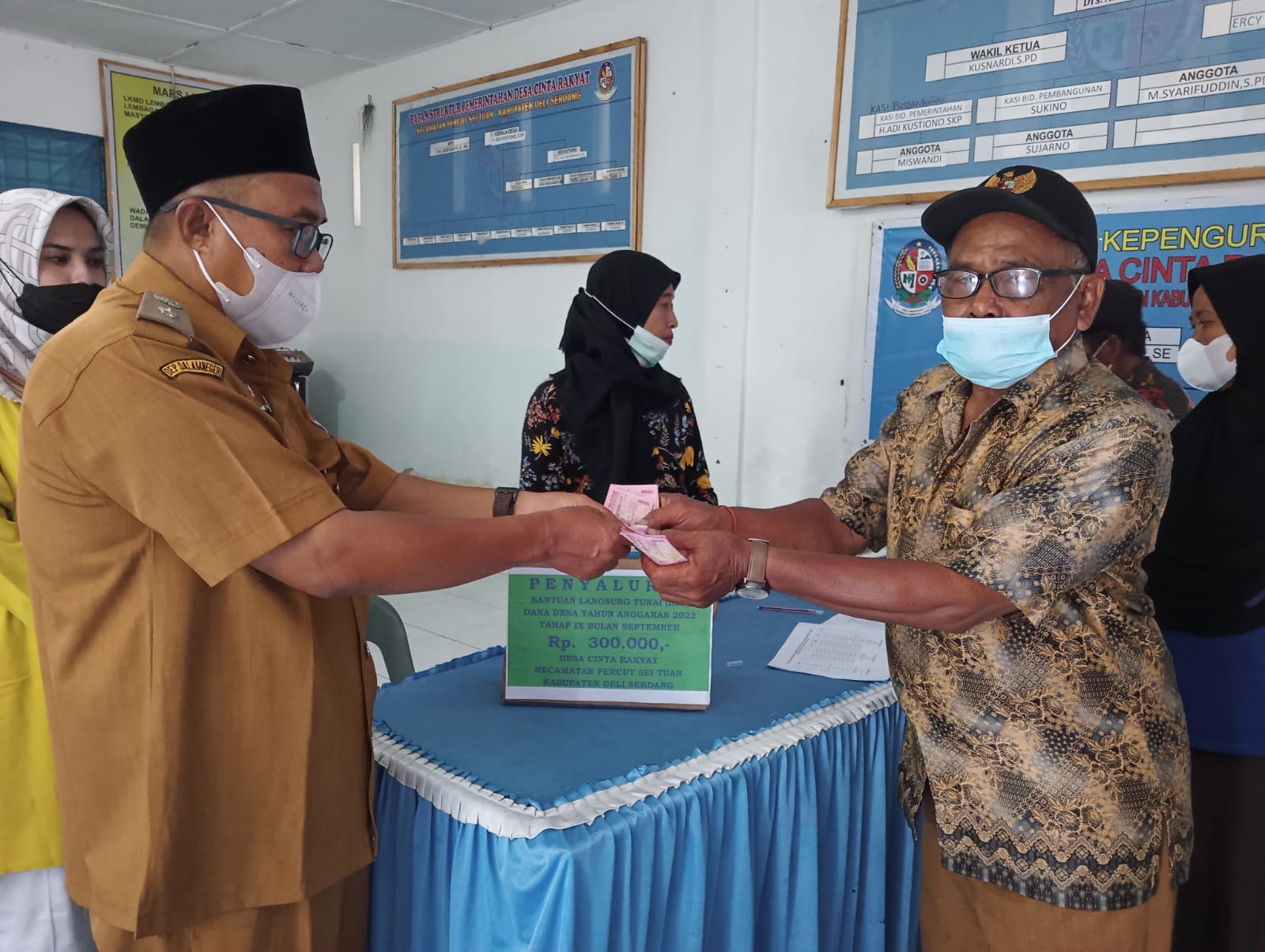 Adapun yang menghadiri pelaksanaan pembagian bantuan tersebut, Kepala Desa Cinta Rakyat, H. Adi Kustiono, S. KP. Sekretaris Desa , Seluruh Staff Desa , Kepala Dusun , Ketua BPD , Pendamping Desa , Babinsa , Bhabinkantibmas , dan para peserta undangan penerimaan BLT Dana Desa .