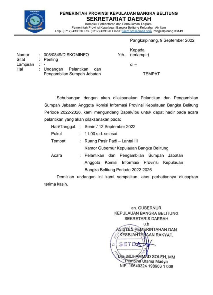Sesuai surat Sekretaris Daerah Bangka Belitung nomor : 005/0849/Diskominfo, tanggal 9 September 2022, hal undangan pelantikan dan pengambilan sumpah jabatan.