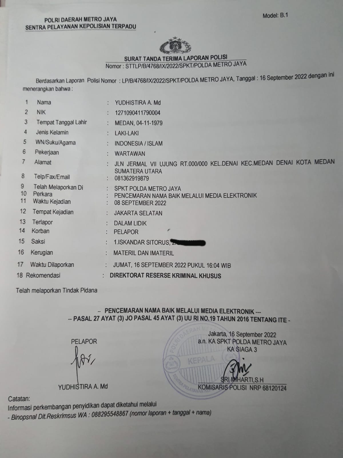 Didampingi penasihat hukumnya Arfan, SH, laporan Yudhistira diterima SPKT Polda Metro Jaya seperti tertuang dalam bukti laporan STTLP/B/4768/IX/2022/SPKT POLDA METRO JAYA.