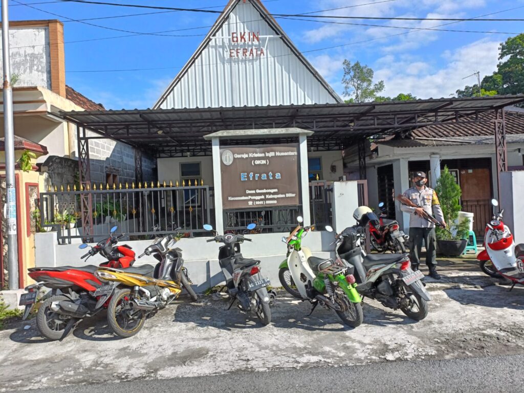 Masyarakat yang mayoritas beragama Kristiani mendatangi gereja melaksanakan ibadah kebaktian setiap hari minggu, Petugas Polsek Ponggok yang pada saat melakukan pengamanan di sejumlah gereja tersebut untuk memberikan rasa aman dan nyaman kepada para Jemaat Gereja yang akan melaksanakan Ibadah serta melakukan aktifitas lainnya.Serta imbauan diberikan kepada jemaat gereja terhadap protokol kesehatan yaitu adaptasi kebiasaan baru, agar para jemaat wajib gunakan masker, cuci tangan sebelum dan sesudah beraktifitas.