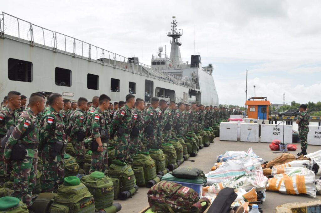 “Embarkasi 447 prajurit Yonif 123/RW dan material logistiknya berlangsung dengan tertib dan tidak ada Prajurit Rajawali yang membawa barang barang yang dilarang oleh undang-undang”. terang Dansatgas
