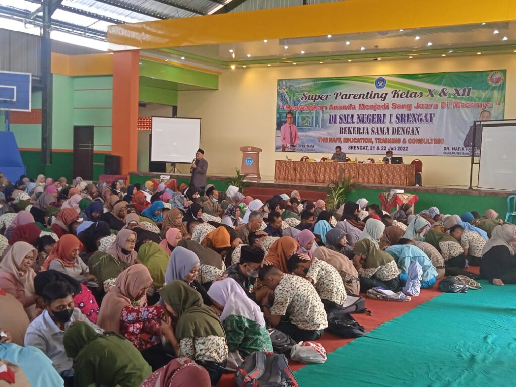 Sering kali keinginan anak dan orang tua tidak sejalan. Untuk meluruskan hal tersebut SMAN 1 Srengat adakan kegiatan Super Parenting kepada kelas X dan XII setelah dilaksanakannya kegiatan MPLS pada Kamis (21/07/2022) dan Jumat (22/07/2022). Kegiatan tersebut diikuti oleh seluruh siswa kelas X, XII dan orangtuanya serta dihadiri oleh pengurus Komite dan juga oleh KaCabdin Solikin, S.Pd., M.Pd. Dalam kesempatan ini mendatangkan narasumber yaitu Grand Master Trainer Internasiomal Dr. Nafik Palil, M.Pd.