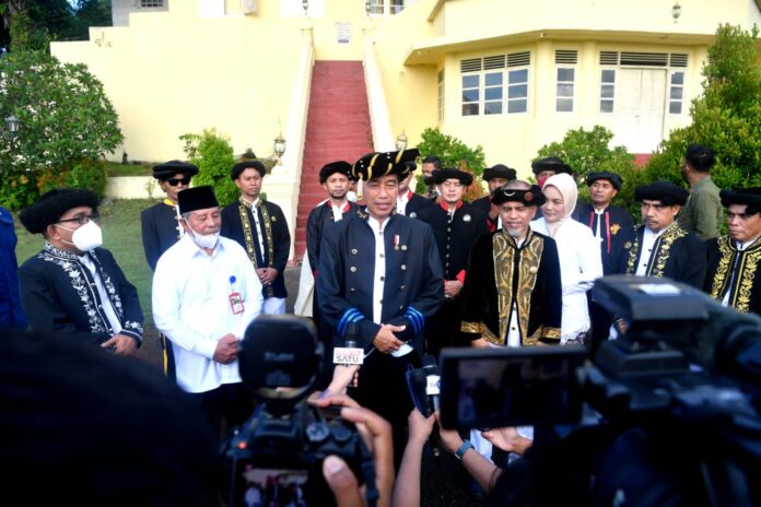 “Pagi hari ini, saya mendapatkan gelar dari Kesultanan Ternate, dari Bapak Sultan Hidayatullah Sjah, Sultan Ternate yang ke-49 dengan gelar ‘Dada Madopo Malomo’. Nanti artinya seperti apa, tanyakan langsung ke Bapak Sultan. Tapi ini adat, tradisi, kearifan lokal memang harus terus kita jaga dan terus kita rawat,” ujar Presiden dalam keterangannya selepas acara.