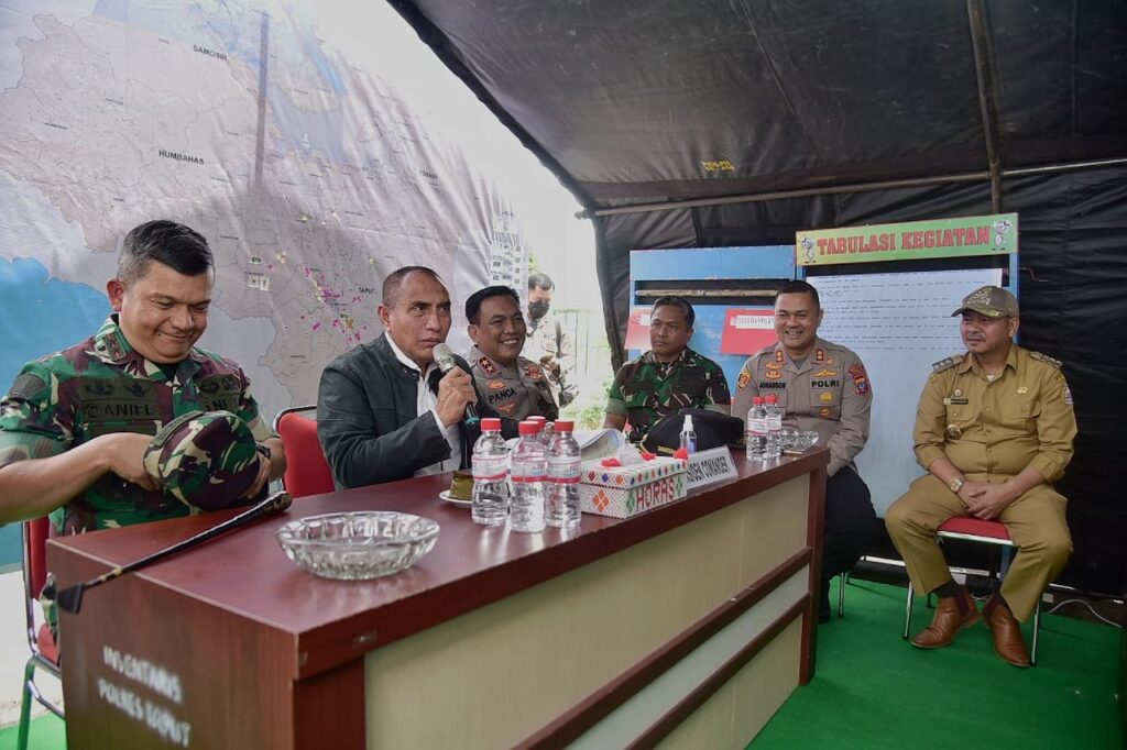 Global Cyber News.Com|Tarutung – Pangdam I/BB, Mayjen TNI Achmad Daniel Chardin, SE, MSi, bersama Kapoldasu, Irjen Pol Drs RZ Panca Putra Simanjuntak, MSi, dan Gubsu, Edy Rahmayadi menyerahkan langsung bantuan kemanusiaan untuk para korban bencana gempa bumi Tapanuli Utara di Posko Bencana Kantor Bupati Taput di Kota Tarutung, Senin (3/10/2022).