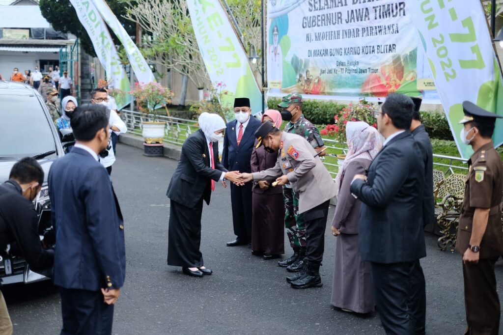 Global Cyber News.Com|Kota Blitar – Kapolres Blitar Kota AKBP Argowiyono S.H S.I.K M.Si bersama Forkopimda Blitar raya mendapingi Gubernur Jatim, Khofifah Indar Parawansa dalam rangka upacara ziarah di Makam Bung Karno, Kota Blitar, Sabtu (8/10/2022).