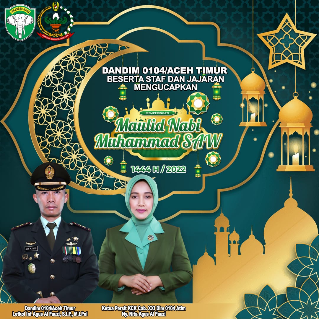Global Cyber News.Com|Langsa – Dandim 0104/Aceh Timur Letkol Inf Agus Al Fauzi, S I.P., M.I.Pol Dan Ketua Persit Kartika Candra Kirana Cabang XXI Dim 0104 Aceh Timur Ny. Nita Agus Al Fauzi menyampaikan ucapan selamat memperingati Maulid Nabi Muhammad SAW 1444 Hijriah Tahun 2022 yang jatuh pada hari ini Tanggal 08 Oktober 2022.