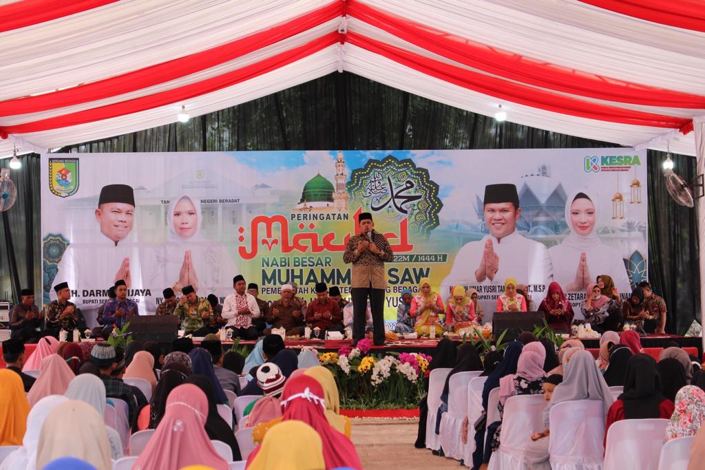 Global Cyber News.Com|Bupati Serdang Bedagai (Sergai) H. Darma Wijaya dan Wakil Bupati (Wabup) H. Adlin Umar Yusri Tambunan, ST, MSP, menghadiri peringatan Maulid Nabi Muhammad SAW 1444 H Kabupaten Sergai Tahun 2022 yang dilaksanakan di lapangan bola kaki Dusun I, Desa Bogak, Kecamatan Teluk Mengkudu, Kamis (13/10/2022).