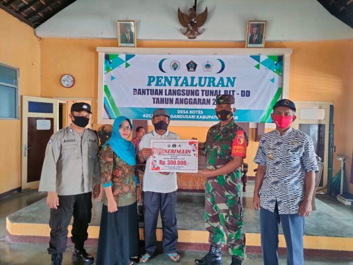 Global Cyber News.Com|Blitar – Babinsa Koramil Tipe B 0808/15 Gandusari Kodim 0808/Blitar Pelda Narko bersama Bhabinkamtibmas selalu bersinergi untuk melaksanakan kegiatan pendampingan penyaluran Bantuan Langsung Tunai Dana Desa (BLT DD) bulan Oktober 2022, kepada 86 Keluarga Penerima Manfaat (KPM), bertempat di Kantor Balai Desa Kotes Kec. Gandusari Kab. Blitar, Sabtu (22/10/2022).