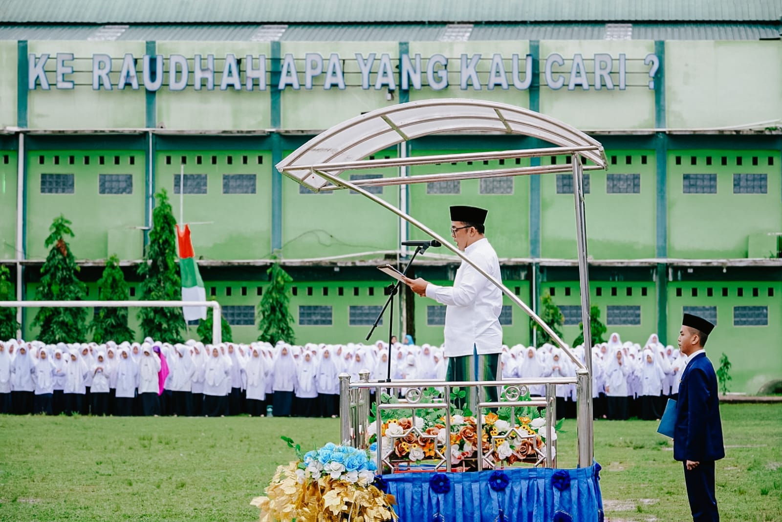 Meski hujan gerimis terus turun sejak pagi namun pelaksanaan upacara Hari Santri Nasional 2022 Kota Medan Tahun 2022 berlangsung lancar dan penuh khidmat di halaman Pondok Pesantren Ar Raudlatul Hasanah Jalan Setia Budi Simpang Selayang Medan, Sabtu (22/10). Wakil Wali Kota Medan H Aulia Rachman yang bertindak sebagai inspektur upacara, berharap peran santri harus terus ditingkatkan.
