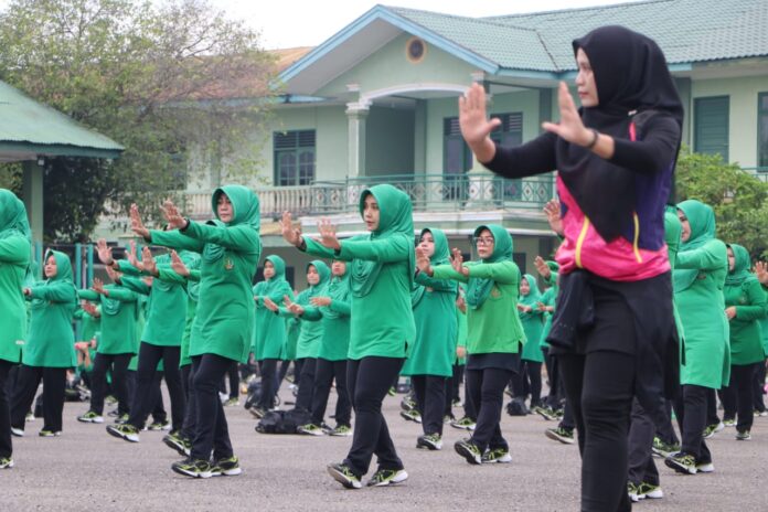Global Cyber News.Com|Langsa – Ny. Nita Agus Al Fauzi selaku Ketua Persit KCK Cab. XXI Dim 0104 Koorcabrem 011 PD Iskandar Muda laksanakan kegiatan senam bersama seluruh istri Prajurit Kodim 0104/Atim yang bertempat di lapangan Makodim Jalan A.Yani Desa Paya Bujok Seulemak Kec. Langsa Baro Kota Langsa.