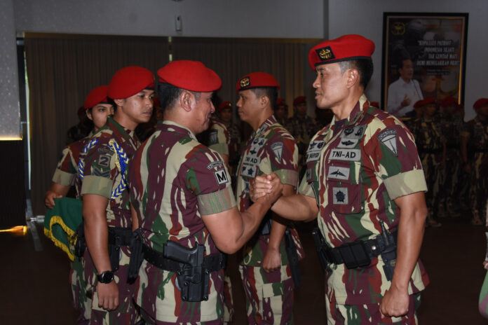 Global Cyber News.Com|JAKARTA – Komando Pasukan Khusus (Kopassus) menerima Laporan Korps Kenaikan Pangkat Pamen, Serah Terima Jabatan Aslog, Penyerahan Jabatan Asren, Asintel, Asops, Aspers dan Kapal Kopassus yang dilaksanakan di Gedung Flamboyan, Mako Kopassus, Jakarta, Senin (3/4/2023).