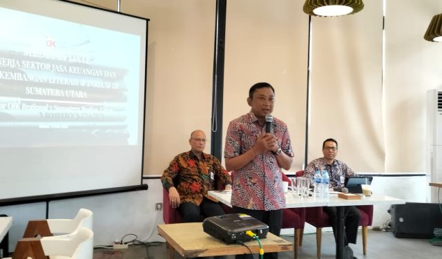 Kepala Otoritas Jasa Keuangan (OJK) Kantor Regional 5 Sumatera Bagian Utara (KR 5 Sumbagut), Bambang Mukti Riyadi didampingi Deputi Direktur Manajemen Strategis, EPK dan Kemitraan Pemda Wan Nuzul dan Deputi Direktur Lembaga Jasa Keuangan (LJK) 1 Anton Purba menyatakan itu, saat Media Lunch Talk bersama awak media, di Medan, Senin (15/05/2023).