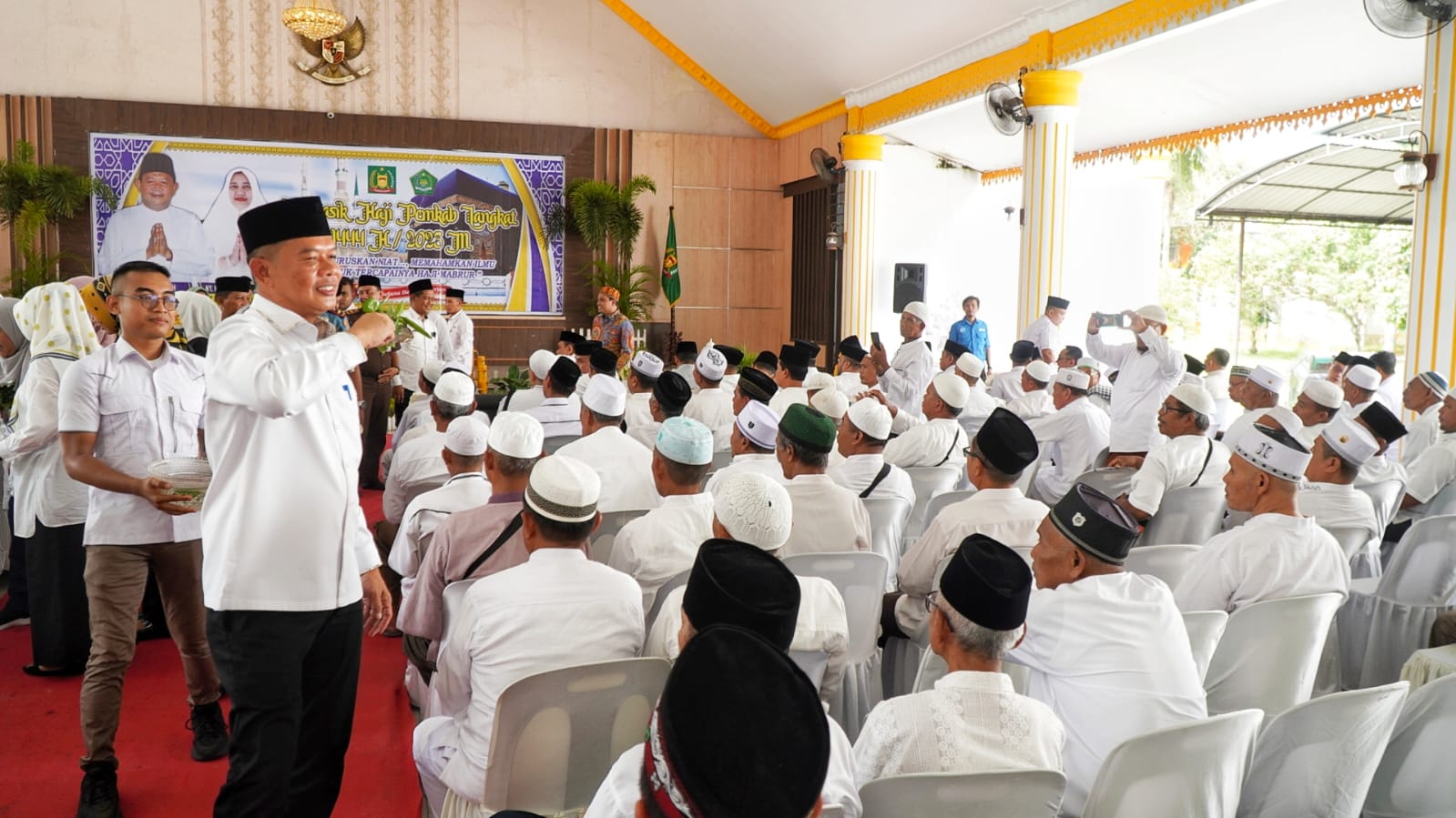 Plt Bupati Langkat H.Syah Afandin SH melalui Sekdakab Langkat H. Amril, S.Sos, M.AP menghadiri manasik sekaligus tepung tawar calon jamaah haji (CJH) Kabupaten Langkat 1444 H/2023 M, di Jentera Malay Rumah Dinas Bupati Langkat, Rabu 24 Mei 2023.