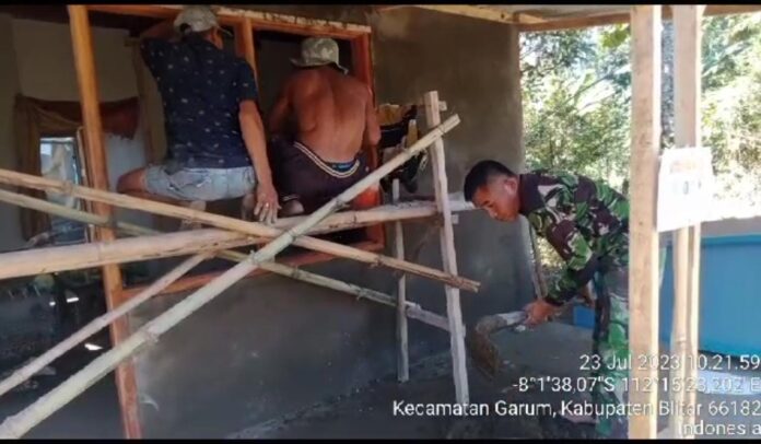globalcybernews.com-Blitar – Dengan penuh semangat, Babinsa Koramil 0808/02 Garum Kodim 0808/Blitar Serma Slamet Riyadi bersama warga masyarakat, melaksanakan kegiatan kerja bakti dan gotong royong, untuk merehab rumah tidak layak huni milik Ibu Sri Nurjanah, bertempat di Dusun Kemloko RT. 2 RW. 9 Desa Sidodadi Kec. Garum Kab. Blitar, Minggu, (23/7/2023).